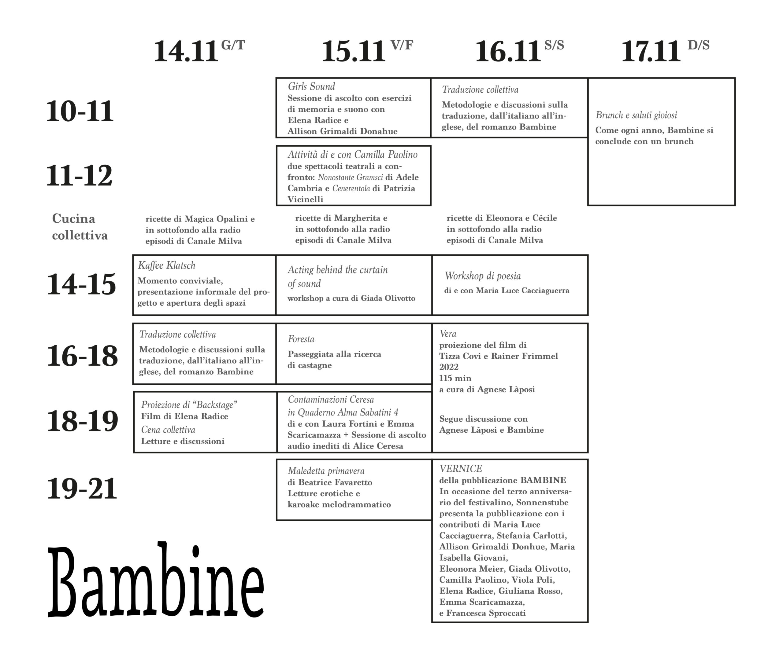Bambine is a festival, a residency, a small community of people that grows from year to year with the intention of opening a self-managed discussion space in Lugano under the mythical figure of Alice Ceresa. The festival features collective translation sessions, readings, workshops, exhibitions, parties and dances, academic panels and film screenings.